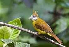 黄腹冠鹎:体长19-24厘米,是一种体型略大的褐色鹎。头顶橄榄褐色具黑褐色羽冠。白色的喉膨起,下体黄色。似白喉冠鹎但较鲜亮,上体褐色较重,腹部为鲜亮的柠檬黄色。虹膜褐色;嘴黑色;脚粉红色。…全部>>
