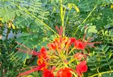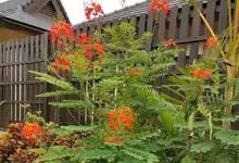 洋金凤 Sw.),豆科小凤花属灌木状或小乔木植物,枝无毛,绿或粉绿色;二回羽状复叶;总状花序伞房状,萼片无毛,花瓣橙红或黄色,圆形,花丝红色,子房无毛,花柱橙黄色;荚果窄而薄,…全部>>