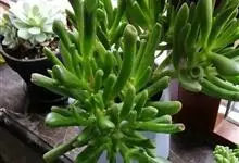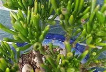 筒叶花月,是景天科青锁龙属的多年生草本植物。植株多分株,灌木状,茎较粗壮,圆柱形,表皮灰褐色;叶片肉质,互生,呈圆筒状,簇生于茎或分枝顶端,叶端呈斜截形,截面为椭圆形;花呈星状,淡白色;花期秋季。…全部>>
