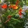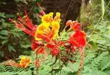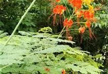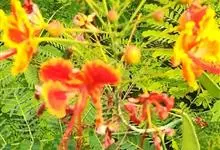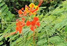 洋金凤 Sw.),豆科小凤花属灌木状或小乔木植物,枝无毛,绿或粉绿色;二回羽状复叶;总状花序伞房状,萼片无毛,花瓣橙红或黄色,圆形,花丝红色,子房无毛,花柱橙黄色;荚果窄而薄,…全部>>