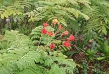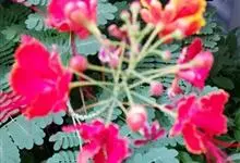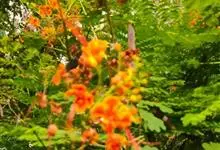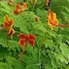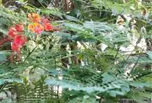 洋金凤 Sw.),豆科小凤花属灌木状或小乔木植物,枝无毛,绿或粉绿色;二回羽状复叶;总状花序伞房状,萼片无毛,花瓣橙红或黄色,圆形,花丝红色,子房无毛,花柱橙黄色;荚果窄而薄,…全部>>