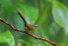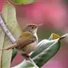 普通缝叶莺,是雀形目鹅科莺亚科缝叶莺属一种。体长10-14厘米,体重7-10克,雄鸟前额棕红,头顶至枕棕橄榄褐,上体橄榄绿染黄,飞羽及尾羽暗褐;繁殖期雄鸟的中央尾羽特形延长,下体淡皮黄白色。…全部>>