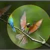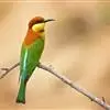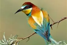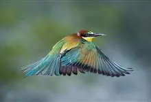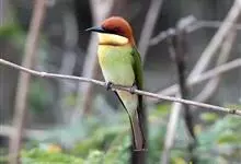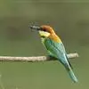 栗喉蜂虎是蜂虎科蜂虎属的鸟类。有热带鸟类羽毛艳丽的特征:喉部是栗红色的,黑色的过眼纹,翅膀和背部是绿色的,尾翼是蓝色的,飞行时翅膀下面的羽毛是橙黄色的,在阳光的照射下,它们全身闪烁着金属般的艳丽光泽,…全部>>