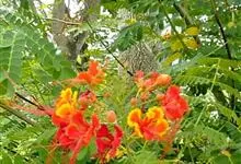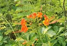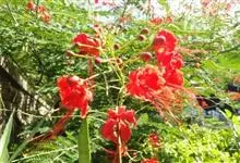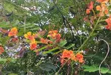 洋金凤 Sw.),豆科小凤花属灌木状或小乔木植物,枝无毛,绿或粉绿色;二回羽状复叶;总状花序伞房状,萼片无毛,花瓣橙红或黄色,圆形,花丝红色,子房无毛,花柱橙黄色;荚果窄而薄,…全部>>