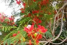 洋金凤 Sw.),豆科小凤花属灌木状或小乔木植物,枝无毛,绿或粉绿色;二回羽状复叶;总状花序伞房状,萼片无毛,花瓣橙红或黄色,圆形,花丝红色,子房无毛,花柱橙黄色;荚果窄而薄,…全部>>