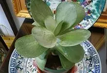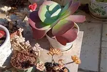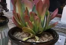 唐印为景天科伽蓝菜属的多年生肉质草本植物。植株中型,株高50厘米,宽20厘米,多分枝;叶片肉质,对生,卵形,全缘,先端钝圆,叶片淡绿色至灰绿色,表面被有厚厚的白粉,光照充足时,叶缘呈红色;圆锥花序,…全部>>