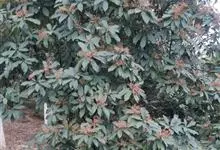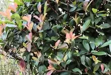 石楠 Kalkman),是蔷薇科石楠属的常绿乔木,高5~12米,株型紧凑,树冠圆球形。树枝为褐灰色;鳞片为褐色,没有毛;叶片革质,长椭圆至侧卵状椭圆形,有锯齿,新叶红色光亮。复伞房花序,白色小花,…全部>>