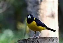 黄颈拟蜡嘴雀:小型鸟类,体长20-22厘米。嘴粗大,黑色。雄鸟整个头、颈、颏、喉和上胸辉黑色,两翅和尾亦为黑色,其余上体橙黄色,下体鲜黄色。雌鸟头、颈、颏、喉和上胸中央灰色或暗灰色,…全部>>