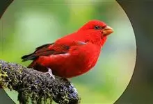 血雀雀科朱雀属鸟类,体重36-49克;体长155-182毫米。雄鸟除眼先、翼与尾为黑色外,通体为鲜红色;嘴鲜黄;雌鸟暗橄榄绿色,羽端较淡或带黄色;腰鲜黄;嘴较暗。虹膜褐色;嘴黄色;腿和脚褐色。…全部>>