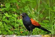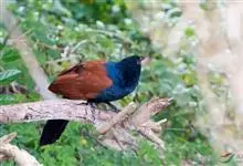 褐翅鸦鹃,是鹃形目鸦鹃科鸦鹃属的鸟类。褐翅鸦鹃的身体为黑色;头颈和胸带蓝紫色金属光泽并具黑亮的羽干纹,下胸至腹部泛金属绿光泽;两翼和肩部为棕栗色,外侧飞羽具暗色羽端,尾羽闪铜绿色光泽;虹膜赤红色,…全部>>