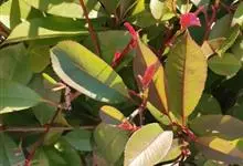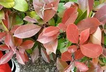红叶石楠 是蔷薇科,石楠属杂交种,为常绿小乔木或灌木,乔木高可达5米、灌木高可达2米。叶片革质,长圆形至倒卵状、披针形,叶端渐尖,叶基楔形,叶缘有带腺的锯齿,花多而密,复伞房花序,花白色,梨果黄红色,…全部>>