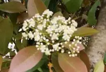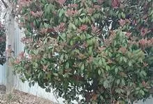 石楠 Kalkman),是蔷薇科石楠属的常绿乔木,高5~12米,株型紧凑,树冠圆球形。树枝为褐灰色;鳞片为褐色,没有毛;叶片革质,长椭圆至侧卵状椭圆形,有锯齿,新叶红色光亮。复伞房花序,白色小花,…全部>>