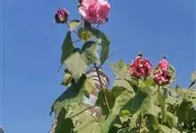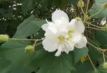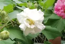 木芙蓉,锦葵科木槿属落叶灌木或小乔木。小枝上有细绒毛;叶片为卵状心形,托叶为披针形,常早落;花单生,花萼为钟形,花冠初为白色或淡红色,后逐渐变为深红色;果实为扁球形,有淡黄色的毛附着。花期8到10月。…全部>>