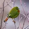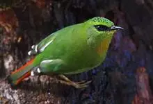火尾绿鹛是莺科、绿鹛属小型鸟类,体长11-14厘米。上体绿色,头顶至枕具黑色鳞状斑,眼先和眼后黑色,眉纹黄绿色。两翅黑色具黄色和红色翅斑及白色端斑,极为醒目。中央一对尾羽绿色,外侧尾羽鲜红色。…全部>>