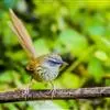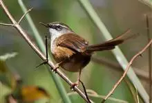 黑喉山鹪莺:体长16厘米,是一种长尾的褐色鹪莺。具明显的白色眉纹及形长的尾。特征为胸具黑色纵纹。上体褐色,两胁黄褐,腹部皮黄;脸颊灰,具明显的白色眉纹及形长的尾。无下髭纹,下体少黑色。虹膜浅褐色,…全部>>