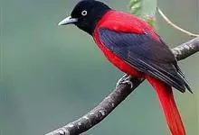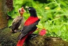 朱鹂:中等鸟类,体长23-28厘米。雄鸟绛紫红色,头、上胸及翼黑色。雌鸟上背及背部深灰色,尾覆羽及尾绛紫红色,腹部及下胸白而密布黑色纵纹。与鹊色鹂幼鸟的区别在上背灰色较深,下体白色较少且纵纹较粗。…全部>>