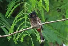 黑喉红臀鹎是雀形目鹎科鹎属鸟类,别称有黑头公、红臀鹎。头顶黑色具光泽;后颈、肩和背暗褐具灰色狭缘;腰羽几纯暗褐,尾上覆羽近白色,羽端浅灰褐色;尾羽褐黑,中央尾羽具狭窄的白色端斑,…全部>>