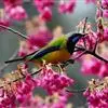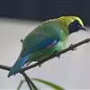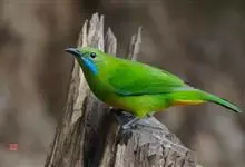 蓝翅叶鹎:小型鸟类,体长15-18厘米。雄鸟通体草绿色,尾蓝绿色,肩和翅亮蓝 色,胸缀有黄色,颏、喉黑色。雌鸟颏,喉蓝绿色。栖息在海拔1500米以下的常绿阔叶林、次生林和林缘疏林灌丛中。…全部>>