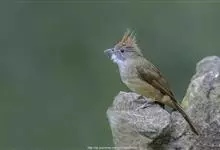 白喉冠鹎:体长20-25厘米。头顶红褐色,有长而细的羽冠、红褐色,头侧灰色。上体橄榄绿黄色,飞羽暗褐色,外翈茶黄色,尾下覆羽皮黄色。…全部>>