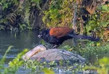 褐翅鸦鹃,是鹃形目鸦鹃科鸦鹃属的鸟类。褐翅鸦鹃的身体为黑色;头颈和胸带蓝紫色金属光泽并具黑亮的羽干纹,下胸至腹部泛金属绿光泽;两翼和肩部为棕栗色,外侧飞羽具暗色羽端,尾羽闪铜绿色光泽;虹膜赤红色,…全部>>