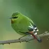 火尾绿鹛是莺科、绿鹛属小型鸟类,体长11-14厘米。上体绿色,头顶至枕具黑色鳞状斑,眼先和眼后黑色,眉纹黄绿色。两翅黑色具黄色和红色翅斑及白色端斑,极为醒目。中央一对尾羽绿色,外侧尾羽鲜红色。…全部>>