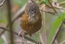 白腹幽鹛,是画眉科幽鹛属鸟类,共有4亚种。雕雄羽色相似。 上体从头到尾包括两题表面概为微椎褐色,两翅和尾沾更多红色。眼先和颚上灰褐色,耳覆羽褐色具族色羽轴纹,颈与背同色。额、喉白色具矢状黑斑,…全部>>