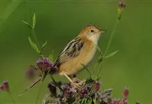 金头扇尾莺体小而具褐色纵纹的莺。嘴细长,略向下弯;翼短,体型娇小,尾长。下体皮黄,喉近白,尾深褐,尾端皮黄。雌雄羽色相近,羽色单调。繁殖期雄鸟顶冠亮金色,腰褐色。雌鸟及非繁殖期雄鸟头顶密布黑色细纹,…全部>>
