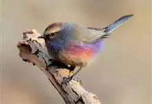 凤头雀莺:小型鸟类。体长9-10厘米,雄鸟呈毛茸茸的紫色和绛紫色,顶冠淡紫灰色,额及凤头白色,尾全蓝。雌鸟喉及上胸白,至臀部渐变成淡紫色,耳羽灰,…全部>>