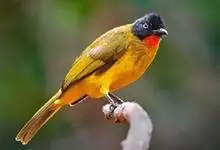 黑头鹎:体长17厘米。是一种中等体型的偏黄色鹎。特征为头辉黑、喉黑而眼蓝。上体黄橄榄色;两翼及尾偏黑,具明显的黄色尾端;下体绿黄色。另一罕见色型为灰色,尾缘白色。与黑冠黄鹎的区别在无羽冠且尾端黄色。…全部>>
