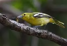 黑翅雀鹎:体重14-19克,体长11.5-16厘米。是树栖性绿色小鸟,外形与叶鹎相似,下体黄色。鸟喙直,翼长而尖,总体羽毛是绿色和黄色相结合,翼上具两道明显近白色横纹,翼近黑而羽缘白。…全部>>
