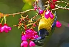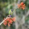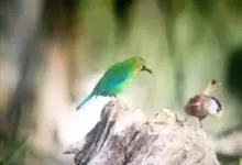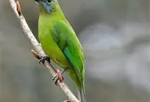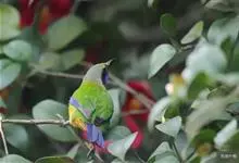 蓝翅叶鹎:小型鸟类,体长15-18厘米。雄鸟通体草绿色,尾蓝绿色,肩和翅亮蓝 色,胸缀有黄色,颏、喉黑色。雌鸟颏,喉蓝绿色。栖息在海拔1500米以下的常绿阔叶林、次生林和林缘疏林灌丛中。…全部>>