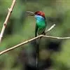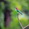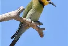 蓝喉蜂是蜂虎科蜂虎属鸟类。体长26-28厘米,嘴长而弯曲,有明显细长的中央尾羽。头部、颈部和背部为巧克力色,有黑色眼纹。喉部、腰部和尾羽为蓝色。腹部和两翼为绿色。幼鸟外观似成鸟,头部、颈部和背部为绿色,…全部>>