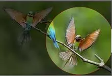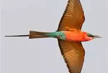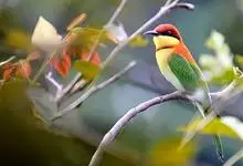 栗喉蜂虎是蜂虎科蜂虎属的鸟类。有热带鸟类羽毛艳丽的特征:喉部是栗红色的,黑色的过眼纹,翅膀和背部是绿色的,尾翼是蓝色的,飞行时翅膀下面的羽毛是橙黄色的,在阳光的照射下,它们全身闪烁着金属般的艳丽光泽,…全部>>