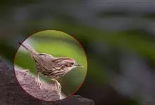 矛斑蝗莺:体长11-14厘米,体重9-13克。上体橄榄褐色密布粗著的黑褐色纵纹,眉纹淡黄色细而不明显,下体乳白色具黑色纵纹,尾羽腹面无白端。虹膜暗褐色;嘴黑褐色,下嘴基黄褐色;脚肉色。…全部>>