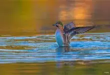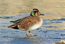 绿翅鸭是小型鸭类,体长37厘米,体重约0.5千克。嘴脚均为黑色。雄鸟头至颈部深栗色,头顶两侧从眼开始有一条宽阔的绿色带斑一直延伸至颈侧,尾下覆羽黑色,两侧各有一黄色三角形斑,在水中游泳时,极为醒目。…全部>>