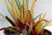 京之华锦是独尾草科瓦苇属的一种植物。也叫凝脂菊,为京之华的斑锦变异品种,植株群生,扁棒状三角形肉质叶排成莲座状,叶表平展,背部隆起,全叶有黄色或白色纵向缟纹,少数叶整片都呈黄色或白色。株型小巧,…全部>>
