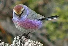 凤头雀莺:小型鸟类。体长9-10厘米,雄鸟呈毛茸茸的紫色和绛紫色,顶冠淡紫灰色,额及凤头白色,尾全蓝。雌鸟喉及上胸白,至臀部渐变成淡紫色,耳羽灰,…全部>>