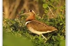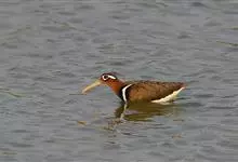 彩鹬是彩鹬科、彩鹬属下的一种小型涉禽,体长25厘米左右。嘴细长,尖端向下弯曲,雄鸟头具淡黄色中央纹。眼周黄色,并向后延伸成一柄状带。背具白色横斑,两侧具黄色纵带。胸侧至背有一白色宽带。雌鸟喉和前颈粟色。…全部>>