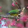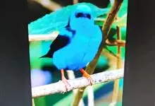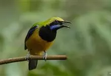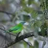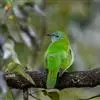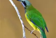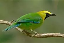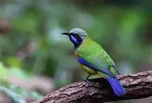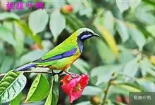 蓝翅叶鹎:小型鸟类,体长15-18厘米。雄鸟通体草绿色,尾蓝绿色,肩和翅亮蓝 色,胸缀有黄色,颏、喉黑色。雌鸟颏,喉蓝绿色。栖息在海拔1500米以下的常绿阔叶林、次生林和林缘疏林灌丛中。…全部>>