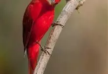 血雀雀科朱雀属鸟类,体重36-49克;体长155-182毫米。雄鸟除眼先、翼与尾为黑色外,通体为鲜红色;嘴鲜黄;雌鸟暗橄榄绿色,羽端较淡或带黄色;腰鲜黄;嘴较暗。虹膜褐色;嘴黄色;腿和脚褐色。…全部>>