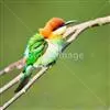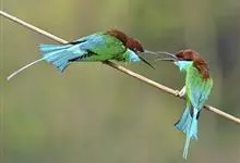 栗喉蜂虎是蜂虎科蜂虎属的鸟类。有热带鸟类羽毛艳丽的特征:喉部是栗红色的,黑色的过眼纹,翅膀和背部是绿色的,尾翼是蓝色的,飞行时翅膀下面的羽毛是橙黄色的,在阳光的照射下,它们全身闪烁着金属般的艳丽光泽,…全部>>