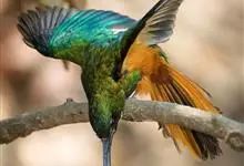 蓝喉蜂是蜂虎科蜂虎属鸟类。体长26-28厘米,嘴长而弯曲,有明显细长的中央尾羽。头部、颈部和背部为巧克力色,有黑色眼纹。喉部、腰部和尾羽为蓝色。腹部和两翼为绿色。幼鸟外观似成鸟,头部、颈部和背部为绿色,…全部>>