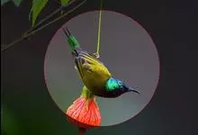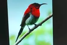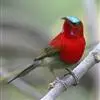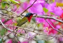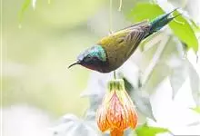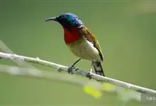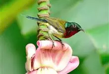 绿喉太阳鸟:共有9个亚种。小型鸟类,雄鸟体长13-15厘米、雌鸟10-12厘米。雄鸟前额至后颈、颏和喉辉绿色,头侧黑色,颈侧和背暗红色,两肩、下背橄榄绿色,腰鲜黄色,尾上覆羽和中央尾羽暗绿色,…全部>>