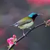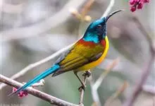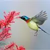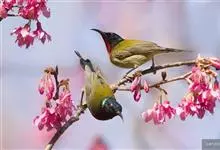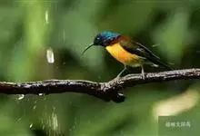 黑胸太阳鸟:小型鸟类,体长9-15厘米。嘴细长而向下曲。雄鸟中央尾羽特长,尾呈楔形,头顶至后颈紫蓝色具金属光泽;背褐红色,腰有一黄色横带,尾上覆羽和尾紫蓝色;颏、喉和上胸乌黑色,有的下胸为硫黄色,…全部>>