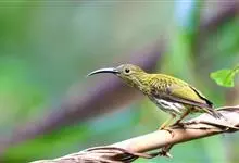 纹背捕蛛鸟:为太阳鸟科捕蛛鸟属的鸟类。是太阳鸟科中体型较大的一种,体重25-45克,体长160-210毫米。嘴粗长而尖且向下弯曲。上体橄榄黄色具黑色中央斑纹。下体淡黄白色满布黑色纵纹,尾具黑色次端斑。…全部>>