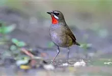 红点颏:是鸟纲、鹟科的鸣禽。又名西伯利亚歌鸲。体长14-17厘米,体重16-27克。雄鸟头部、上体主要为橄榄褐色。眉纹白色。颏部、喉部红色,周围有黑色狭纹。胸部灰色,腹部白色。雌鸟颏部、喉部不呈赤红色,…全部>>