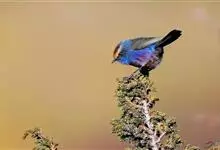 凤头雀莺:小型鸟类。体长9-10厘米,雄鸟呈毛茸茸的紫色和绛紫色,顶冠淡紫灰色,额及凤头白色,尾全蓝。雌鸟喉及上胸白,至臀部渐变成淡紫色,耳羽灰,…全部>>
