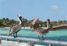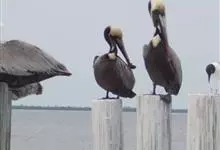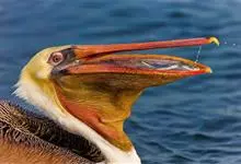 褐鹈鹕:是鹈鹕家族中体型最小的成员。体型粗大,体重6.5-9千克。嘴形宽大直长,上嘴尖端朝下弯曲,呈钩状;下嘴分左右二支,其间有一巨大而能扩缩的皮肤喉囊;鼻孔小,而位于嘴基。眼前部裸出。颈长而较细小…全部>>