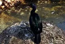 海鸬鹚:俗名乌鹈。典型的海上鸬鹚。体长约70厘米,体羽黑色具光泽。脸红色,与红脸鸬鹚甚似,但繁殖期冠羽较稀疏而松软,脸部红色不及额部但脸颊红色较多,幼鸟及非繁殖期的鸟脸粉灰,体型略小。虹膜蓝色;嘴黄…全部>>