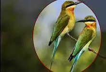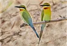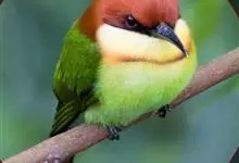 黄喉蜂虎属中型鸟类,体长23-30厘米。喉黄色,其下有一窄的黑色胸带;胸带以下的整个下体蓝绿色。前额蓝白色,具一宽的黑色贯眼纹,头顶至后颈暗栗色,尾蓝绿色,中央尾羽延长,明显突出于其他尾羽。…全部>>